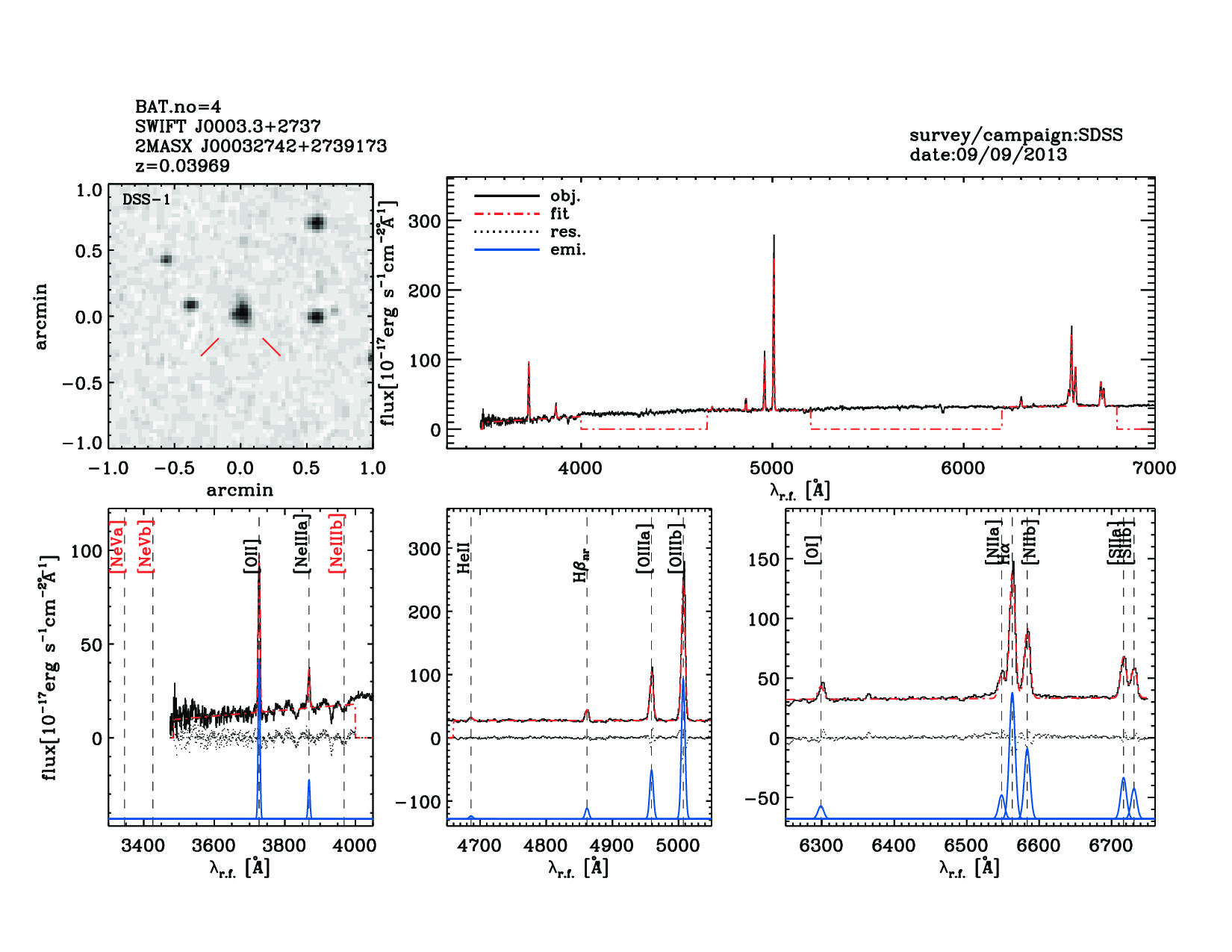 | 4 | SWIFT J0003.3+2737 | 2MASX J00032742+2739173 | 0.8643 | 27.6548 | 0.03969 | 1.70 | 13.00 | 3.10 | 12.80 | 22.86[22.78-22.98] | 1.76(0.28,0.40) | optical | NED |