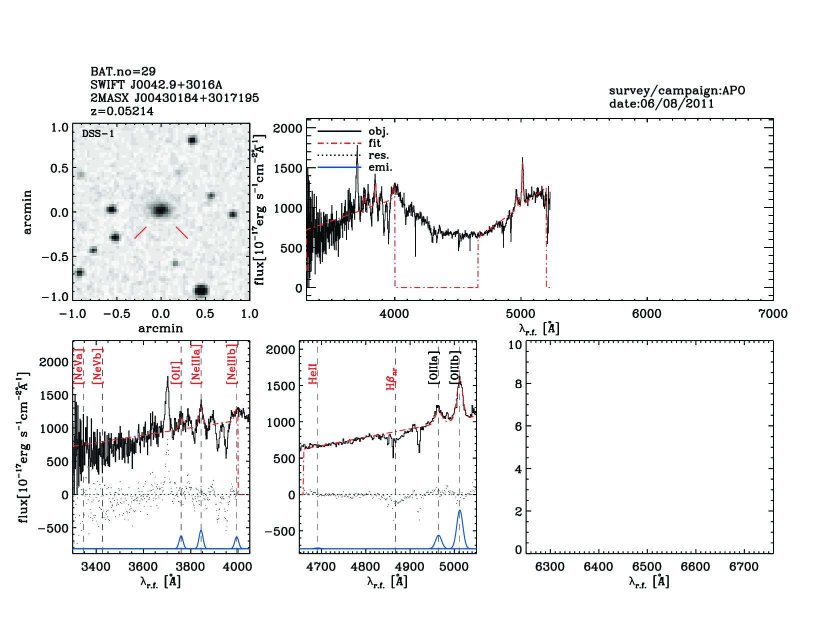 | 29 | SWIFT J0042.9+3016A | 2MASX J00430184+3017195 | 10.7578 | 30.2888 | 0.05214 | 2.20 | 7.70 | 2.60 | 7.80 | 22.30[22.11-22.36] | 2.30(0.37,1.64) | optical | NED |