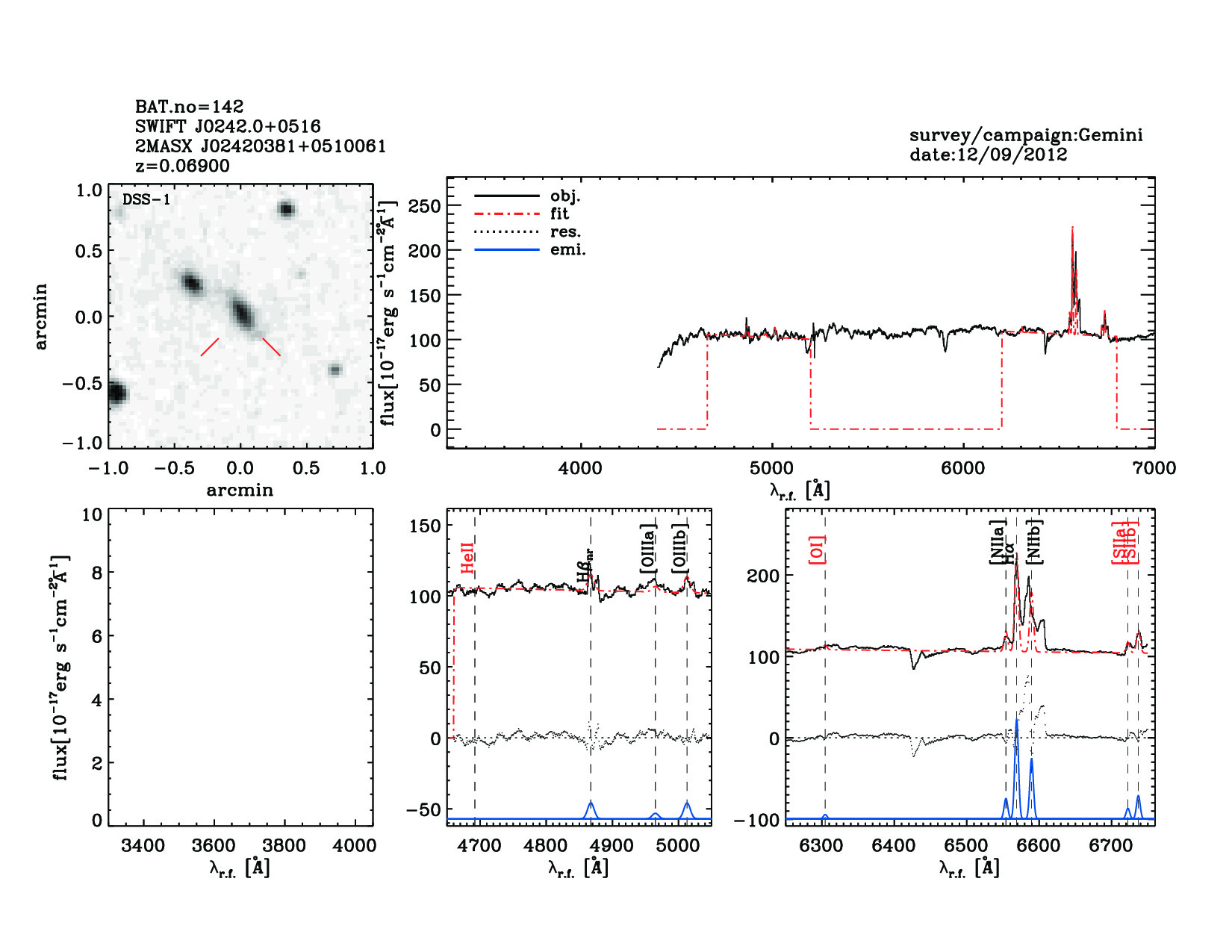 | 142 | SWIFT J0242.0+0516 | 2MASX J02420381+0510061 | 40.5158 | 5.1684 | 0.06900 | 0.70 | 12.20 | 3.10 | 13.10 | 23.50[23.40-23.75] | 1.72(0.59,0.53) | optical | NED |