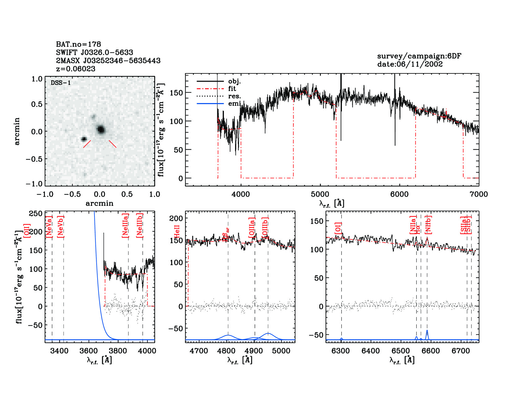| 178 | SWIFT J0326.0-5633 | 2MASX J03252346-5635443 | 51.348 | -56.5957 | 0.06023 | 1.40 | 8.60 | 1.40 | 7.50 | 20.83[20.70-20.95] | 2.58(0.11,0.17) | optical | NED |