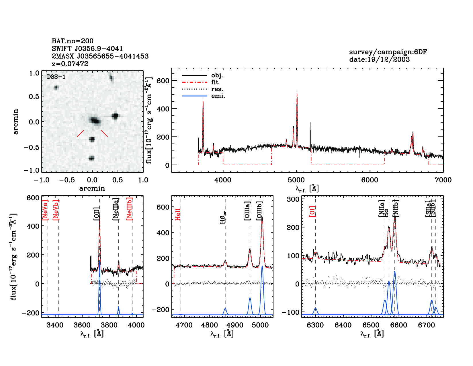 | 200 | SWIFT J0356.9-4041 | 2MASX J03565655-4041453 | 59.2356 | -40.696 | 0.07472 | 2.00 | 19.60 | 2.60 | 15.30 | 22.66[22.62-22.69] | 1.92(0.20,0.18) | optical | NED |