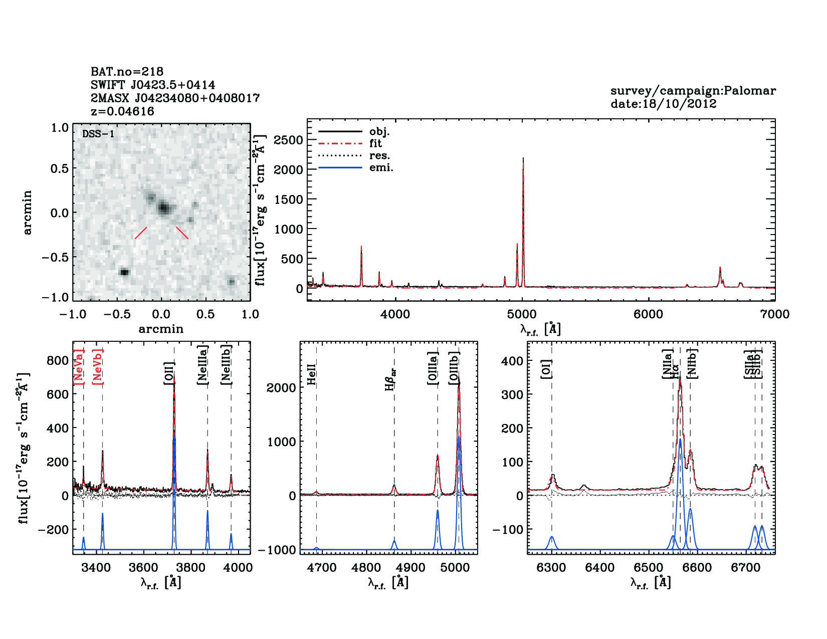| 218 | SWIFT J0423.5+0414 | 2MASX J04234080+0408017 | 65.9199 | 4.1338 | 0.04616 | 1.70 | 23.90 | 14.10 | 35.50 | 23.84[23.76-23.99] | 1.43(0.09,0.14) | optical | NED |