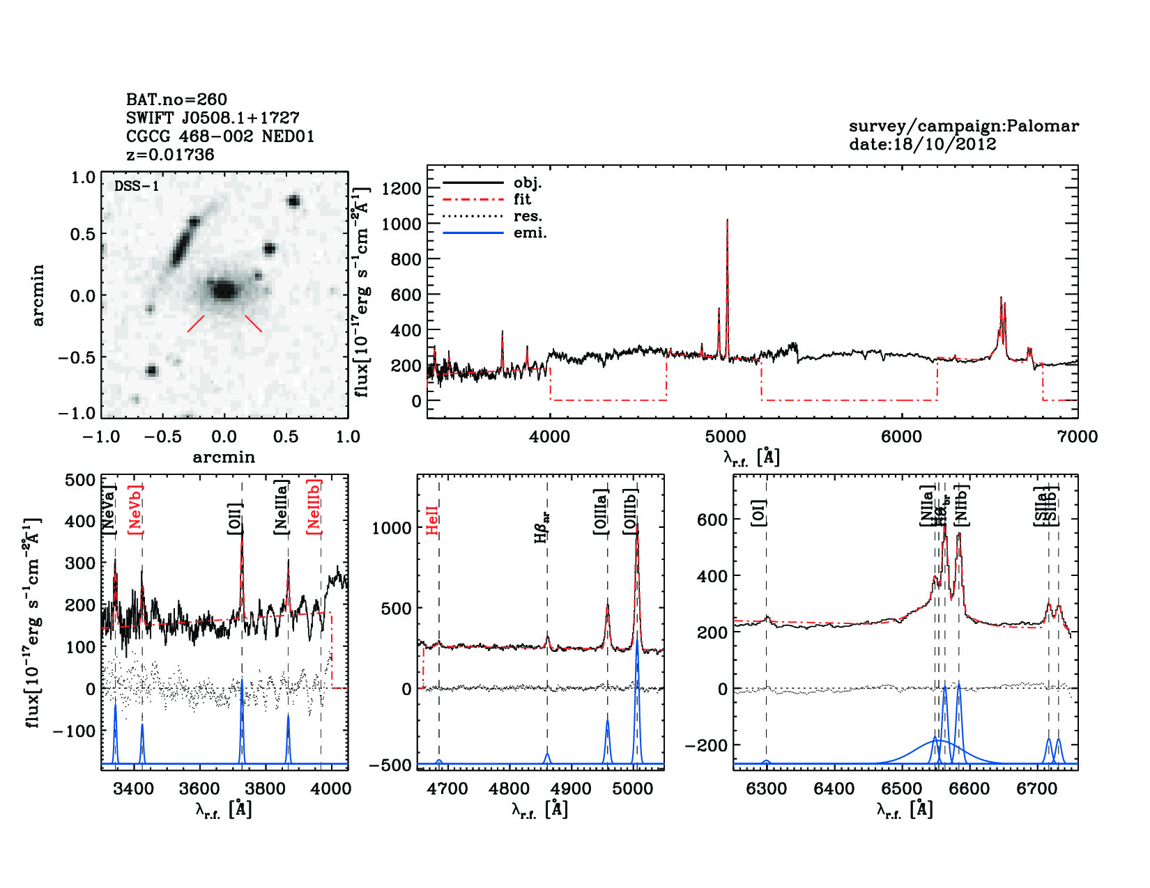 | 260 | SWIFT J0508.1+1727 | CGCG 468-002 NED01 | 77.082 | 17.363 | 0.01736 | 5.20 | 26.00 | 6.00 | 24.00 | 22.33[22.25-22.42] | 1.98(0.16,0.15) | optical | NED |