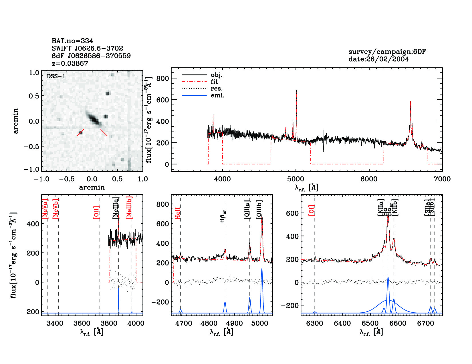 | 334 | SWIFT J0626.6-3702 | 6dF J0626586-370559 | 96.7442 | -37.0996 | 0.03867 | 3.70 | 11.70 | 3.50 | 10.50 | 21.06[20.60-21.23] | 1.76(0.81,0.20) | optical | NED |