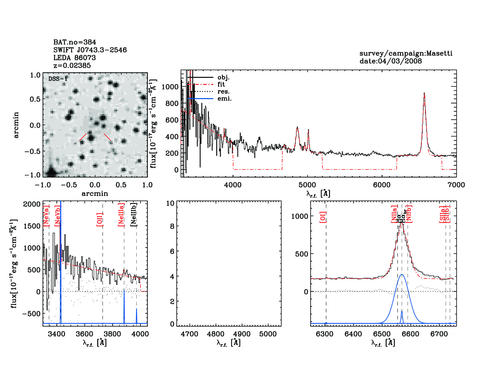 | 384 | SWIFT J0743.3-2546 | LEDA 86073 | 115.8114 | -25.7639 | 0.02385 | 9.50 | 20.70 | 10.20 | 20.70 | 20.95[19.30-21.20] | 2.08(0.14,0.26) | optical | NED |