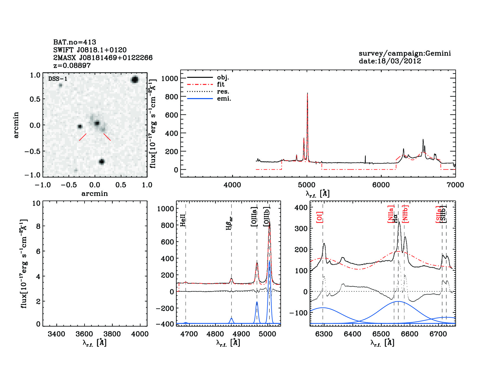 | 413 | SWIFT J0818.1+0120 | 2MASX J08181469+0122266 | 124.561 | 1.374 | 0.08897 | 5.50 | 21.60 | 5.50 | 20.20 | 20.00[20.00-20.00] | 1.48(0.06,0.06) | optical | NED |