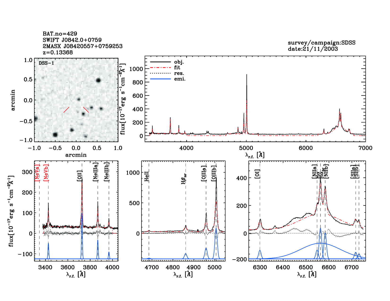 | 429 | SWIFT J0842.0+0759 | 2MASX J08420557+0759253 | 130.5232 | 7.9904 | 0.13368 | 5.30 | 15.70 | 5.50 | 16.20 | 21.78[21.71-21.86] | 1.37(0.34,0.10) | optical | NED |