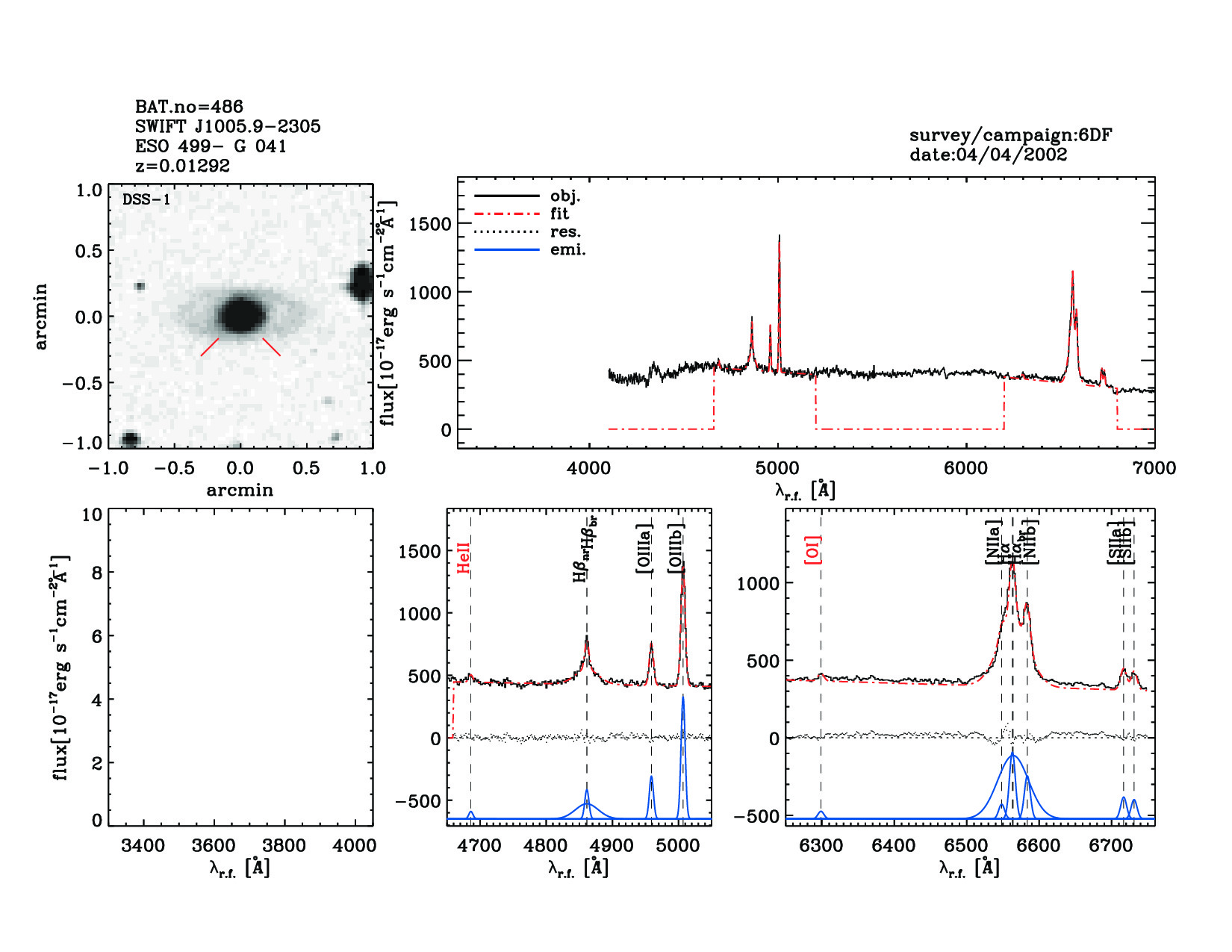 | 486 | SWIFT J1005.9-2305 | ESO 499- G 041 | 151.4807 | -23.0569 | 0.01292 | 7.00 | 14.60 | 7.30 | 15.00 | 20.38[19.52-20.87] | 1.95(0.31,0.15) | optical | NED |