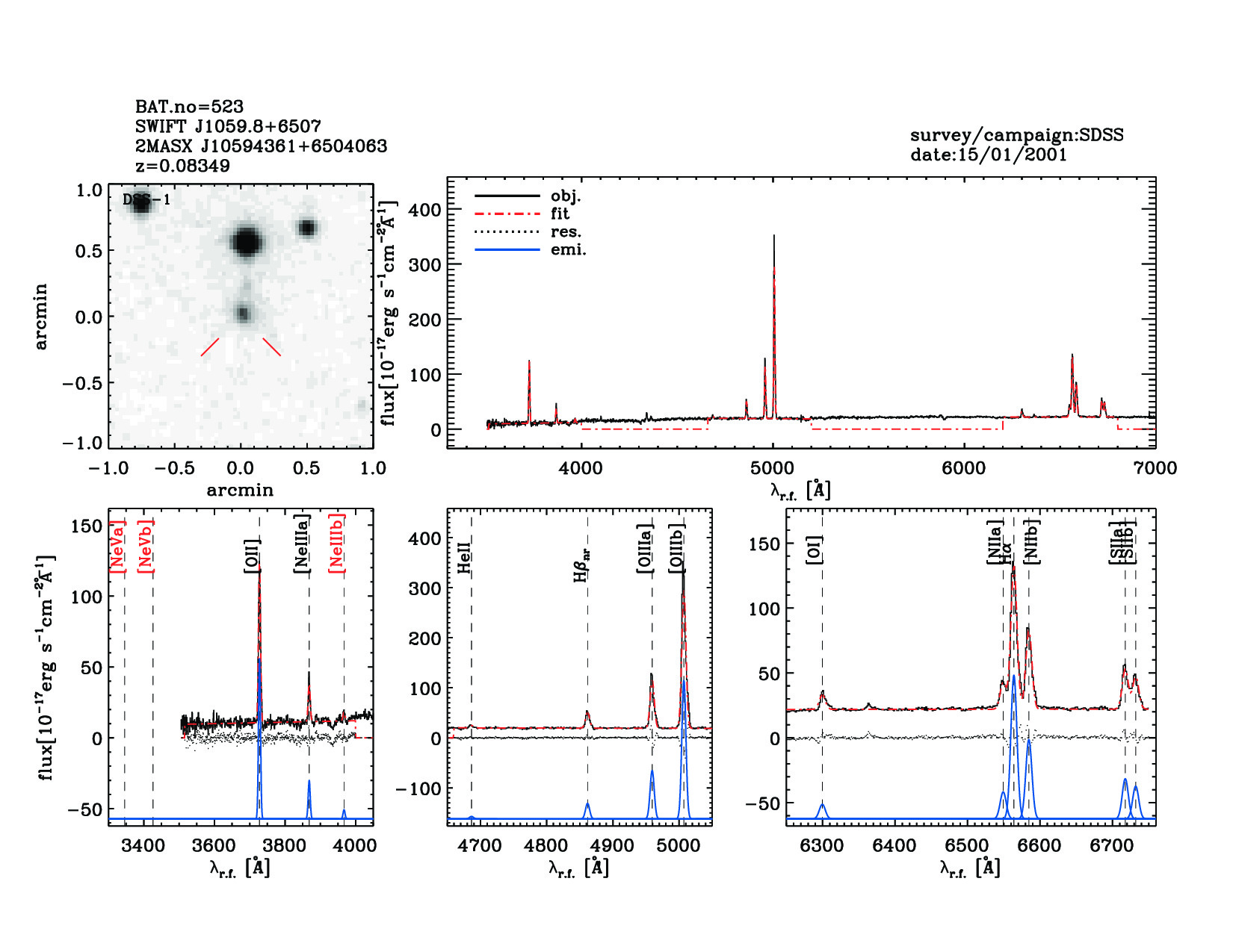 | 523 | SWIFT J1059.8+6507 | 2MASX J10594361+6504063 | 164.9315 | 65.0684 | 0.08349 | 2.00 | 11.50 | 2.50 | 11.00 | 22.53[22.43-22.63] | 1.36(0.24,0.17) | optical | NED |