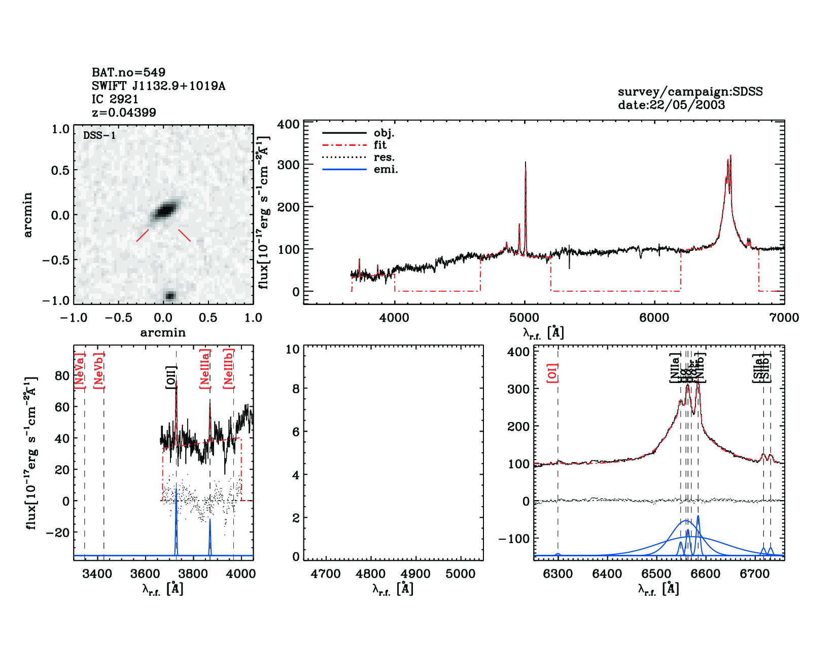 | 549 | SWIFT J1132.9+1019A | IC 2921 | 173.2053 | 10.2965 | 0.04399 | 3.90 | 15.60 | 4.00 | 14.90 | 21.52[21.30-21.75] | 1.79(0.33,0.26) | optical | NED |