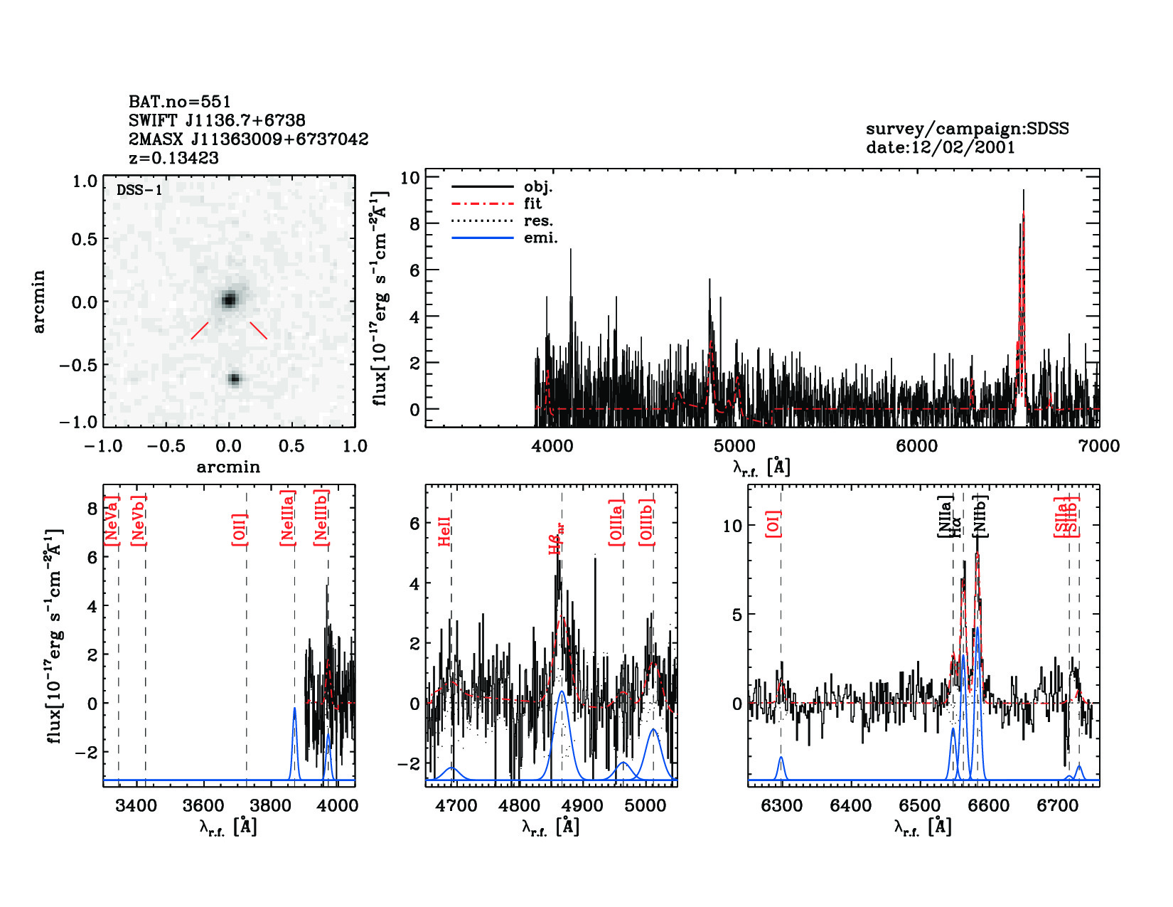 | 551 | SWIFT J1136.7+6738 | 2MASX J11363009+6737042 | 174.1253 | 67.6179 | 0.13423 | 15.00 | 10.70 | 14.90 | 12.90 | 20.74[20.60-20.83] | 2.04(0.04,0.05) | optical | NED |