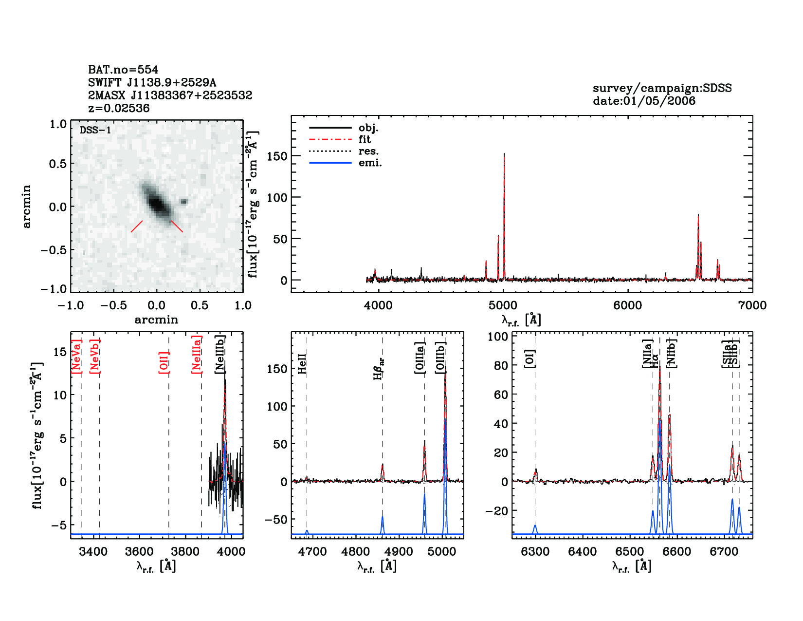 | 554 | SWIFT J1138.9+2529A | 2MASX J11383367+2523532 | 174.6405 | 25.3981 | 0.02536 | 1.60 | 8.90 | 7.30 | 9.60 | 23.48[23.34-23.60] | 2.06(0.19,0.21) | optical | NED |