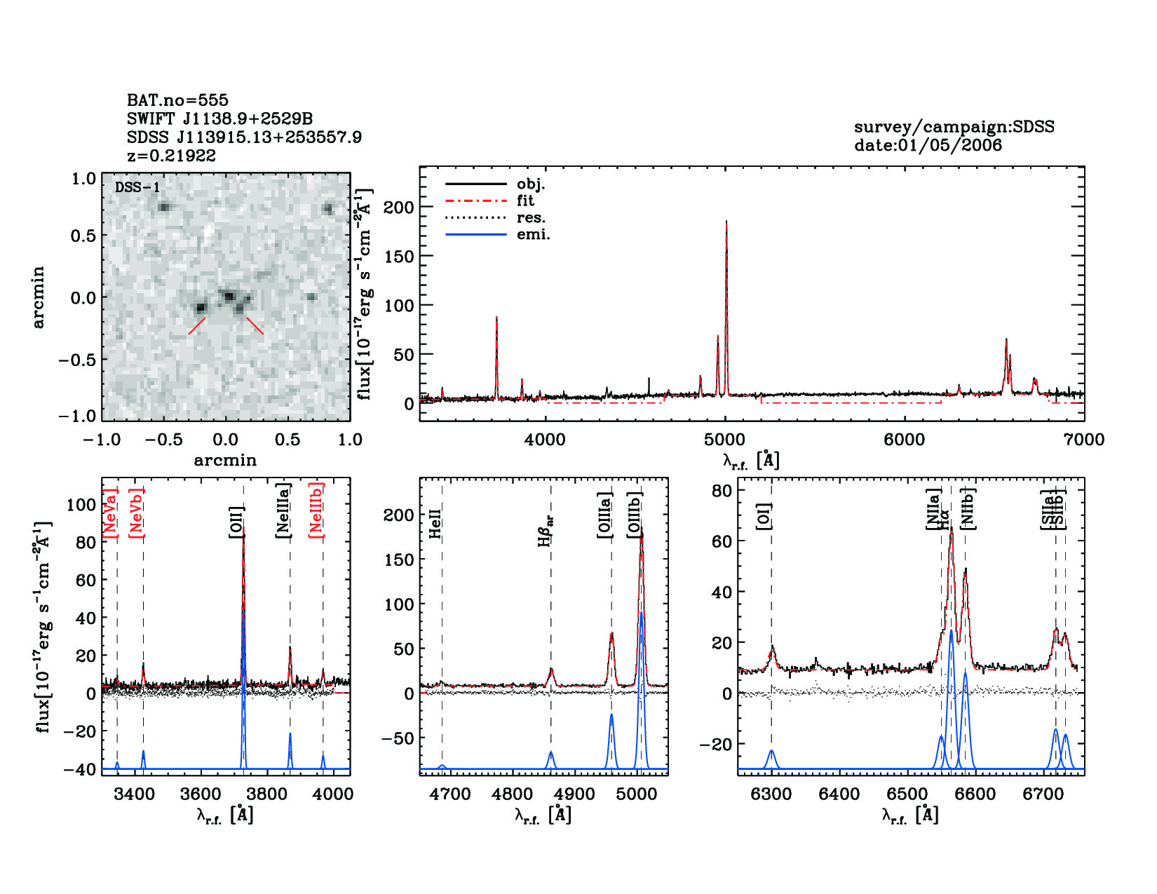 | 555 | SWIFT J1138.9+2529B | SDSS J113915.13+253557.9 | 174.8131 | 25.5994 | 0.21922 | 2.20 | 5.60 | 3.30 | 5.80 | 23.06[22.90-23.18] | 1.56(0.33,0.72) | optical | NED |