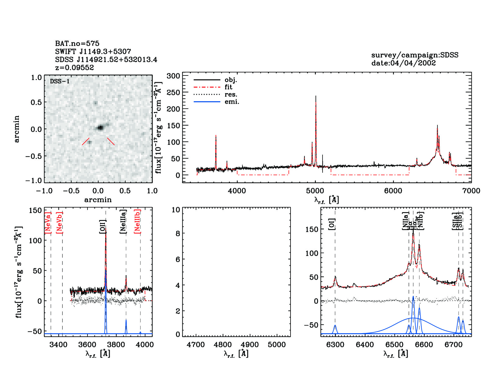 | 575 | SWIFT J1149.3+5307 | SDSS J114921.52+532013.4 | 177.3397 | 53.3371 | 0.09552 | 3.30 | 6.00 | 3.30 | 5.90 | 20.99[20.77-21.15] | 1.67(0.21,0.19) | optical | NED |