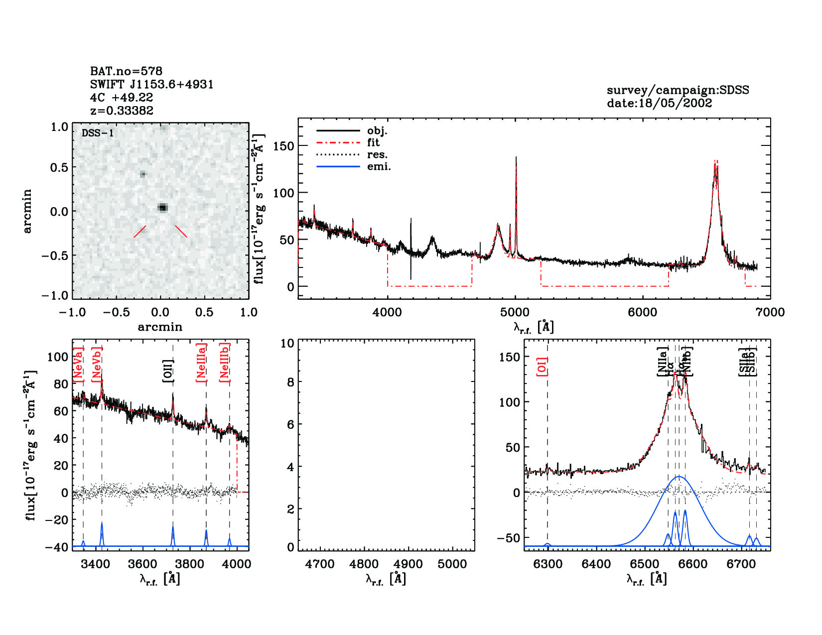 | 578 | SWIFT J1153.6+4931 | 4C +49.22 | 178.3519 | 49.5191 | 0.33382 | 5.60 | 13.50 | 5.70 | 13.30 | 21.34[21.30-21.41] | 1.86(0.05,0.04) | optical | NED |