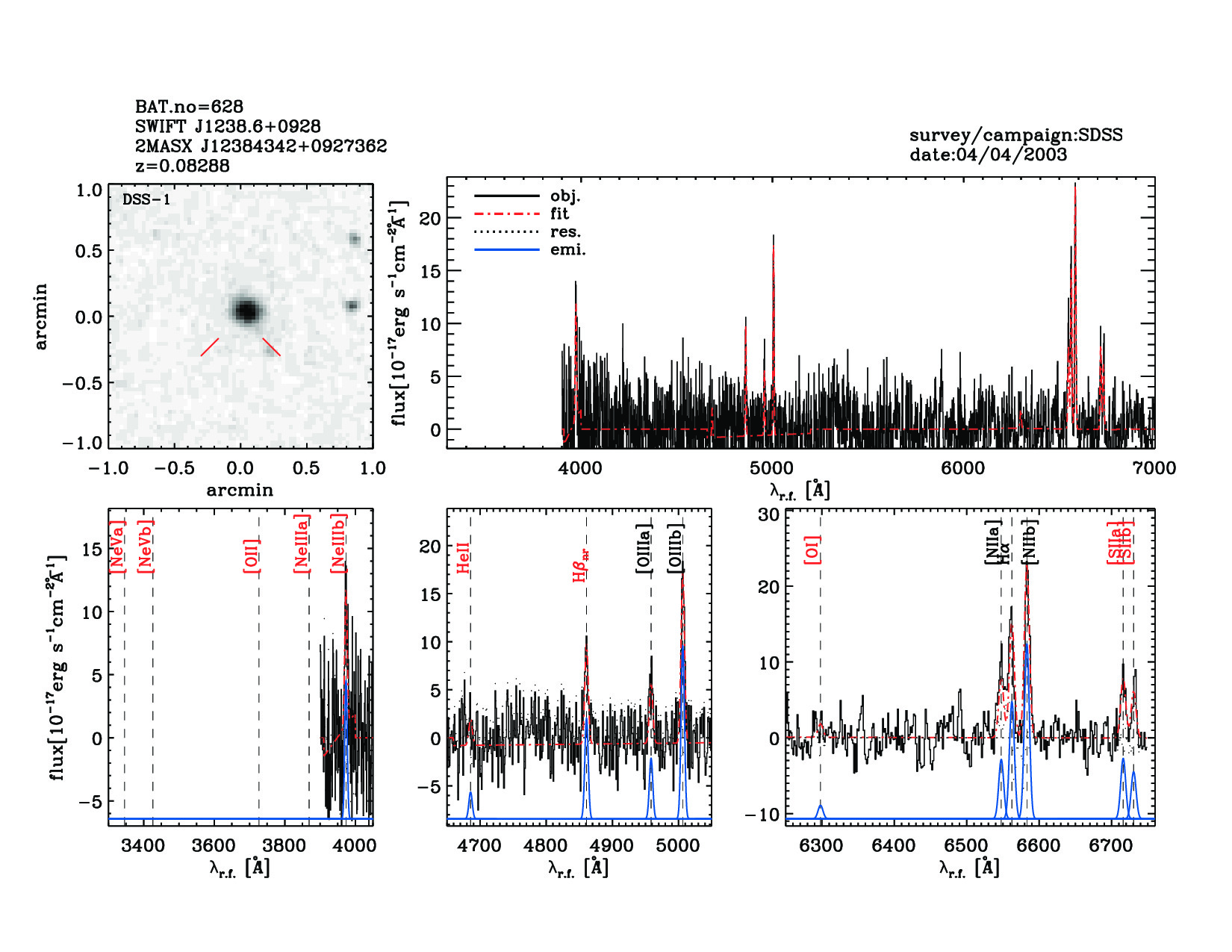 | 628 | SWIFT J1238.6+0928 | 2MASX J12384342+0927362 | 189.5933 | 9.5283 | 0.08288 | 1.10 | 11.60 | 5.00 | 13.60 | 23.60[23.53-23.69] | 1.85(0.32,0.33) | optical | NED |