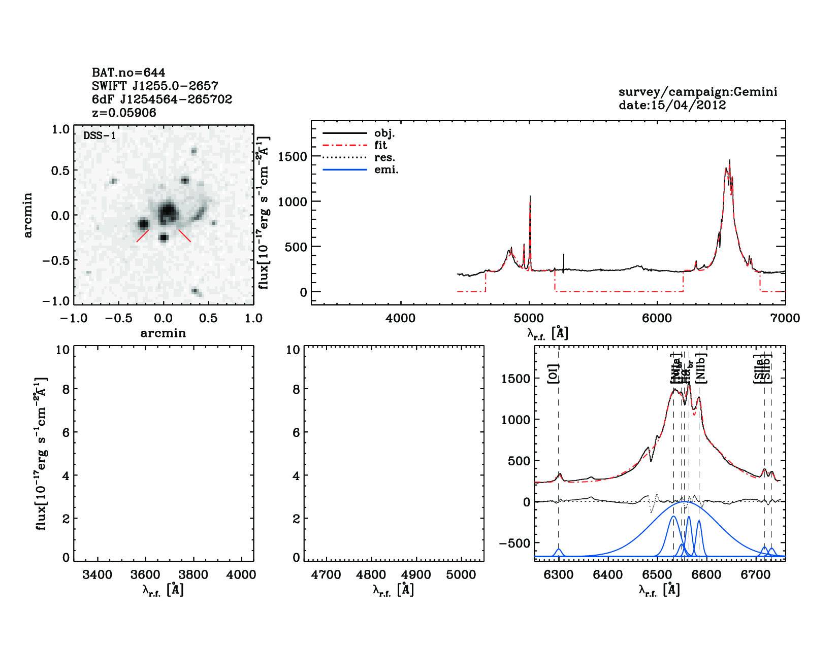 | 644 | SWIFT J1255.0-2657 | 6dF J1254564-265702 | 193.7348 | -26.9505 | 0.05906 | 5.60 | 16.10 | 5.60 | 16.60 | 20.00[20.00-20.00] | 1.48(0.06,0.07) | optical | NED |