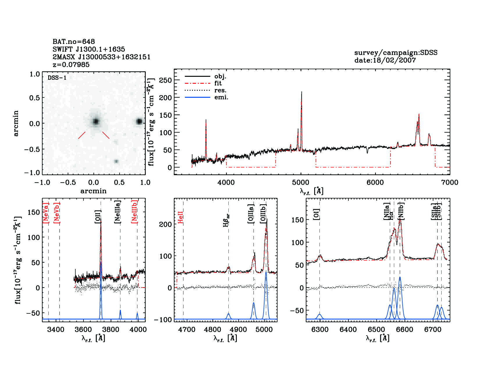 | 648 | SWIFT J1300.1+1635 | 2MASX J13000533+1632151 | 195.0223 | 16.5374 | 0.07985 | 2.10 | 14.40 | 2.20 | 12.70 | 22.27[22.15-22.38] | 1.41(0.35,0.21) | optical | NED |