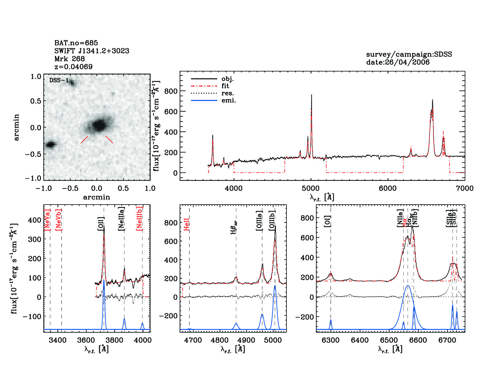 | 685 | SWIFT J1341.2+3023 | Mrk 268 | 205.2964 | 30.3781 | 0.04069 | 2.50 | 19.40 | 9.80 | 22.90 | 23.53[23.46-23.59] | 1.65(0.31,0.27) | optical | NED |
