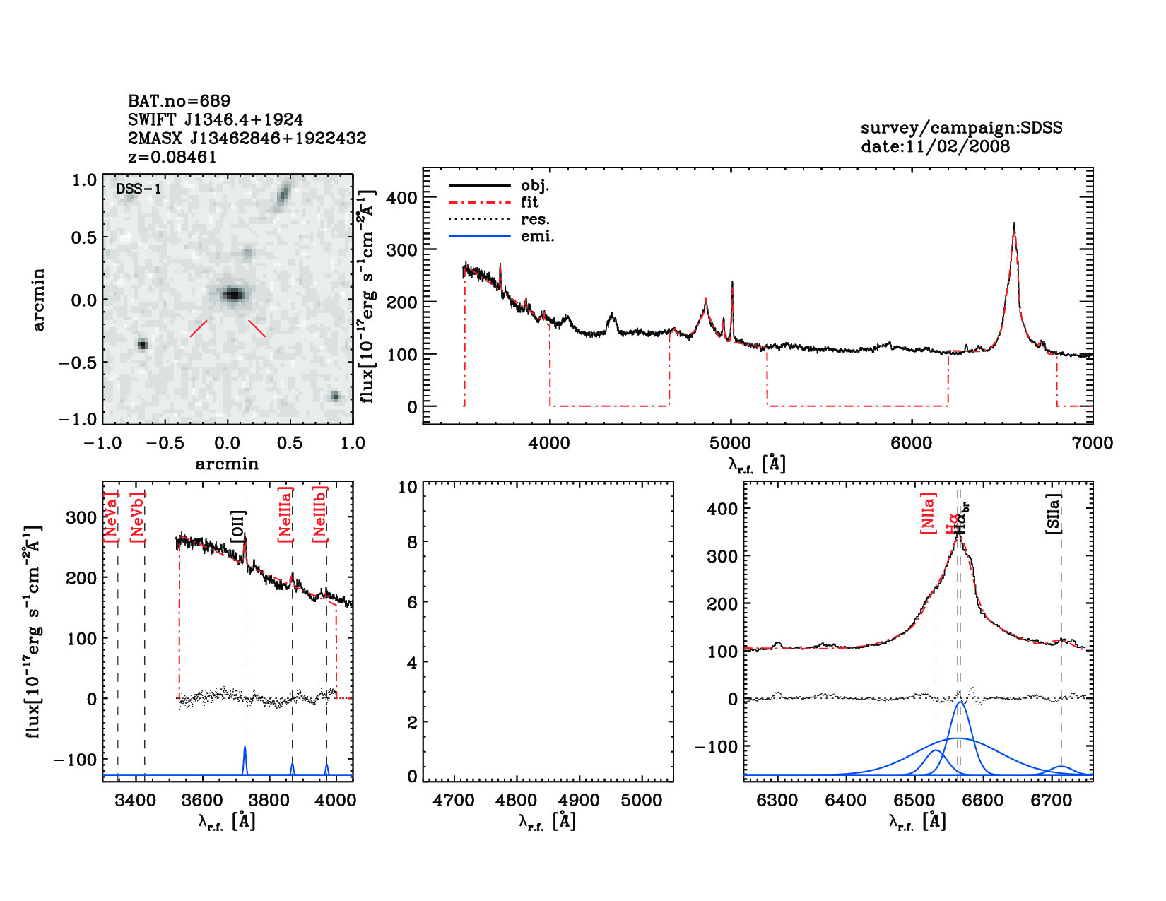 | 689 | SWIFT J1346.4+1924 | 2MASX J13462846+1922432 | 206.6184 | 19.3787 | 0.08461 | 3.00 | 10.80 | 3.00 | 11.70 | 21.26[21.00-21.41] | 1.78(0.18,0.21) | optical | NED |