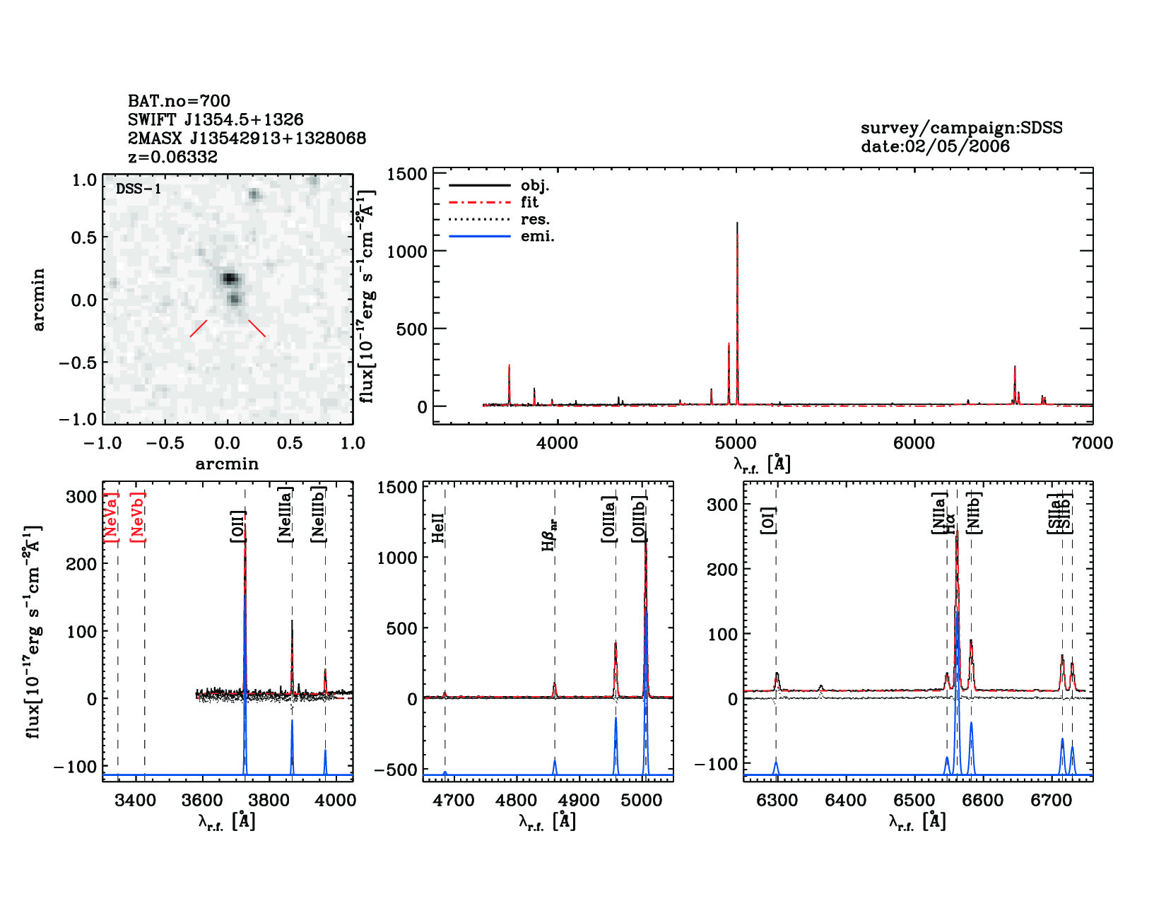 | 700 | SWIFT J1354.5+1326 | 2MASX J13542913+1328068 | 208.6210638 | 13.46591483 | 0.06332 | 1.50 | 9.90 | 4.10 | 10.30 | 23.34[23.25-23.46] | 1.61(0.52,0.59) | optical | NED |