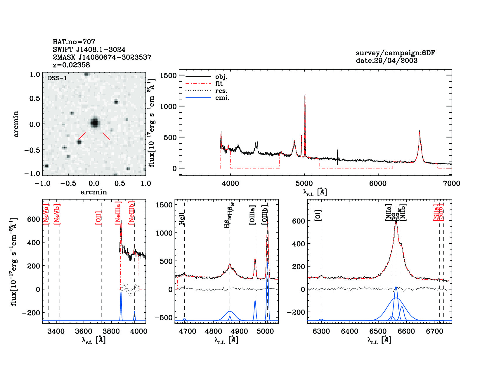 | 707 | SWIFT J1408.1-3024 | 2MASX J14080674-3023537 | 212.0282 | -30.3983 | 0.02358 | 6.60 | 17.20 | 7.90 | 16.00 | 20.00[20.00-20.00] | 2.09(0.25,0.24) | optical | NED |