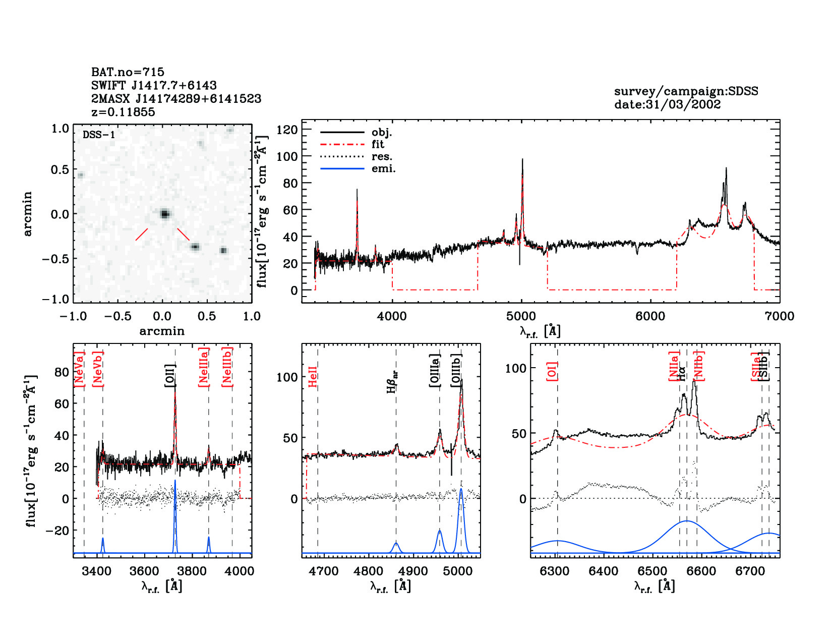 | 715 | SWIFT J1417.7+6143 | 2MASX J14174289+6141523 | 214.4289 | 61.6979 | 0.11855 | 3.00 | 7.10 | 3.00 | 7.00 | 20.00[20.00-20.00] | 1.58(0.09,0.09) | optical | NED |