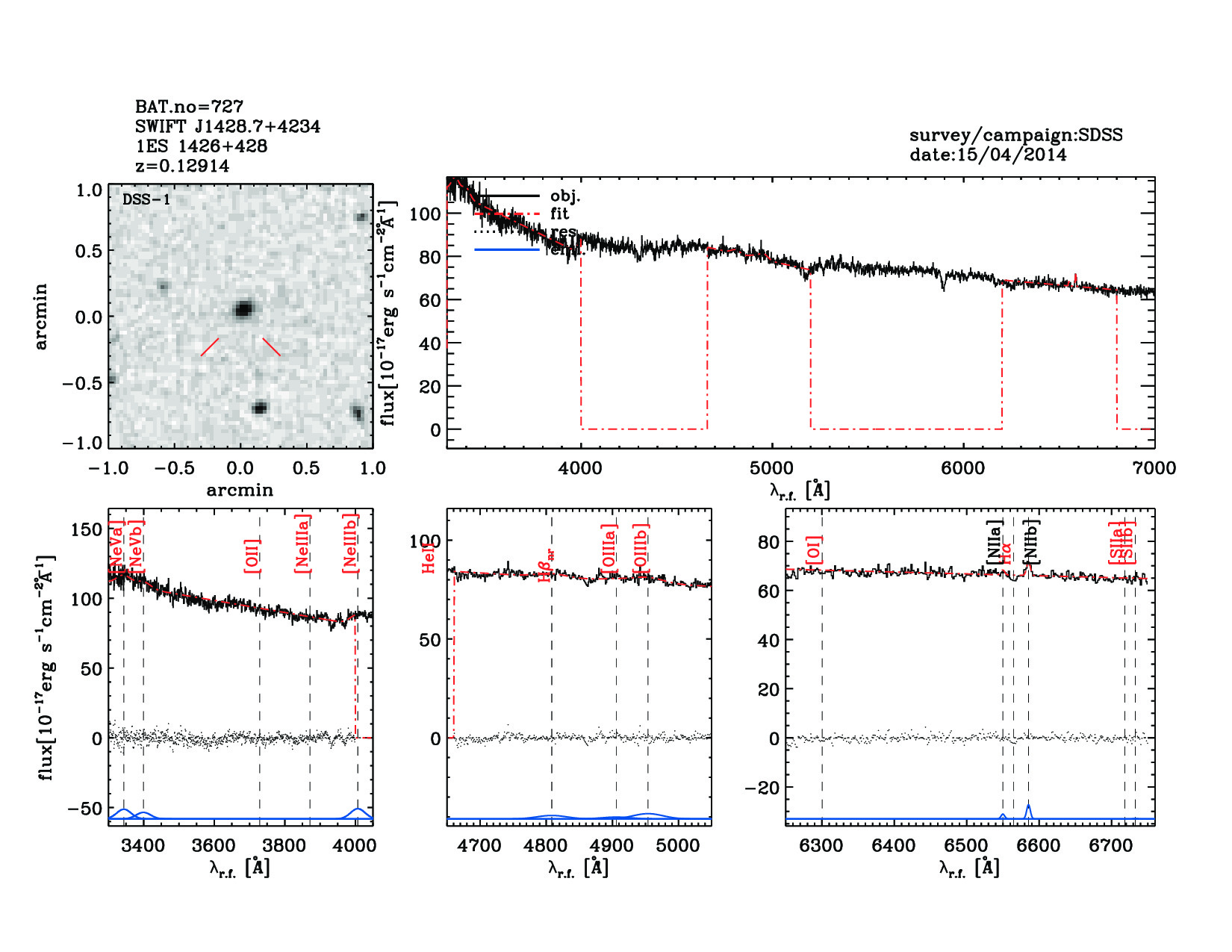 | 727 | SWIFT J1428.7+4234 | 1ES 1426+428 | 217.1361 | 42.6724 | 0.12914 | 44.70 | 22.00 | 44.50 | 22.90 | 20.36[20.20-20.48] | 2.00(0.03,0.03) | optical | NED |