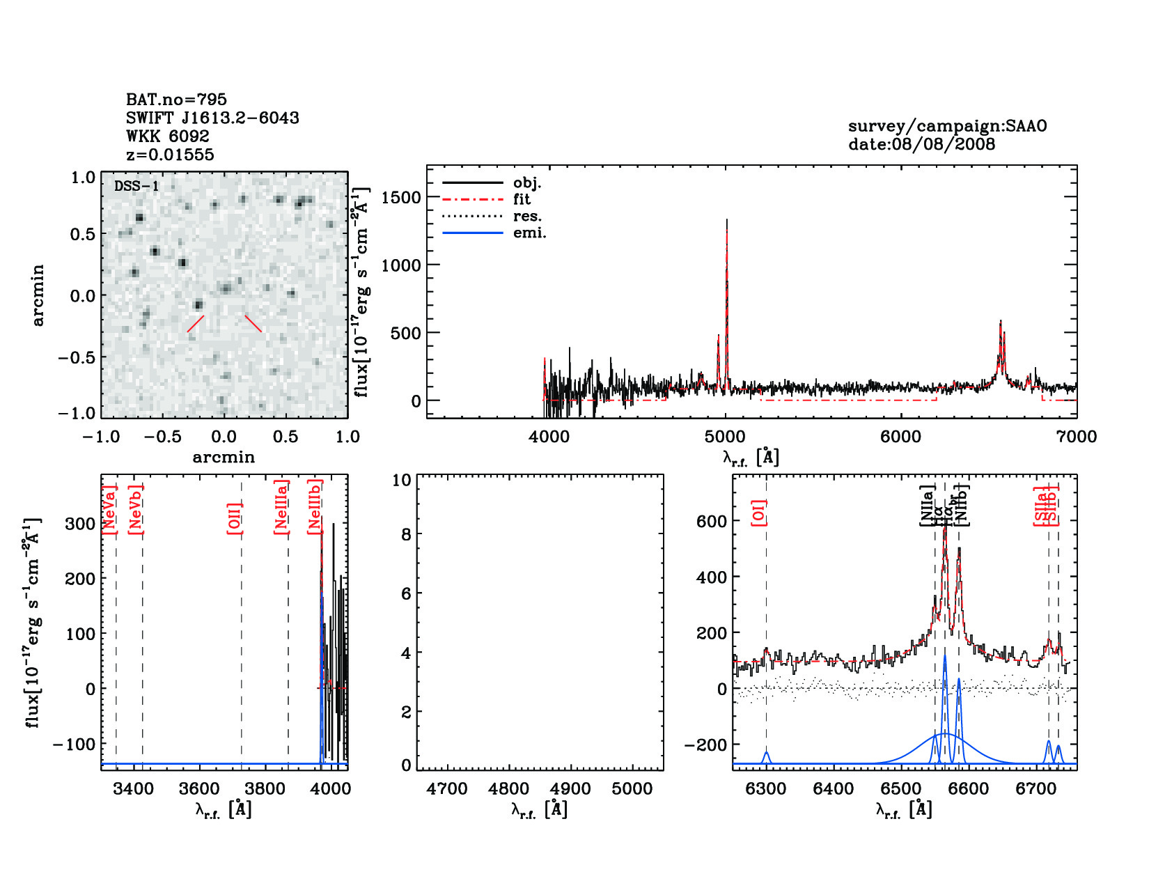 | 795 | SWIFT J1613.2-6043 | WKK 6092 | 242.9642 | -60.6319 | 0.01555 | 4.80 | 32.20 | 4.80 | 33.10 | 20.00[20.00-20.00] | 1.74(0.09,0.20) | optical | NED |