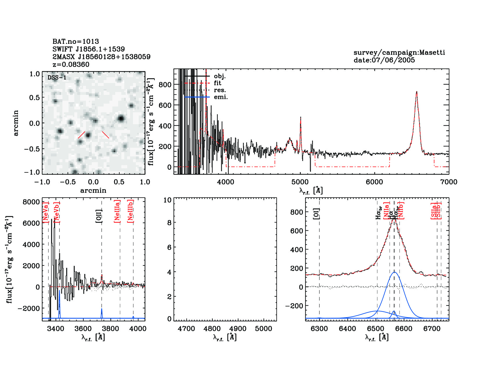 | 1013 | SWIFT J1856.1+1539 | 2MASX J18560128+1538059 | 284.00233 | 15.63289 | 0.08360 | 11.80 | 30.20 | 12.30 | 30.50 | 21.36[21.30-21.40] | 1.76(0.12,0.11) | optical | NED |