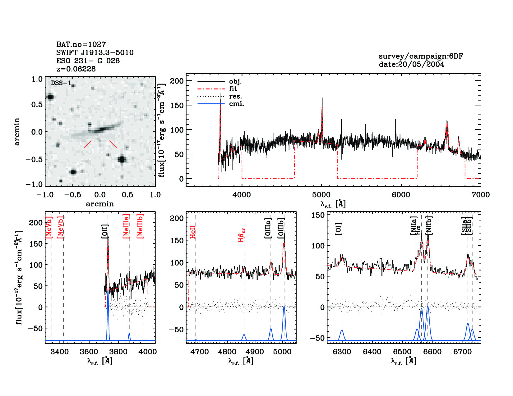 | 1027 | SWIFT J1913.3-5010 | ESO 231- G 026 | 288.3115 | -50.1829 | 0.06228 | 2.70 | 19.30 | 8.40 | 20.00 | 23.38[23.29-23.48] | 1.81(0.13,0.19) | optical | NED |