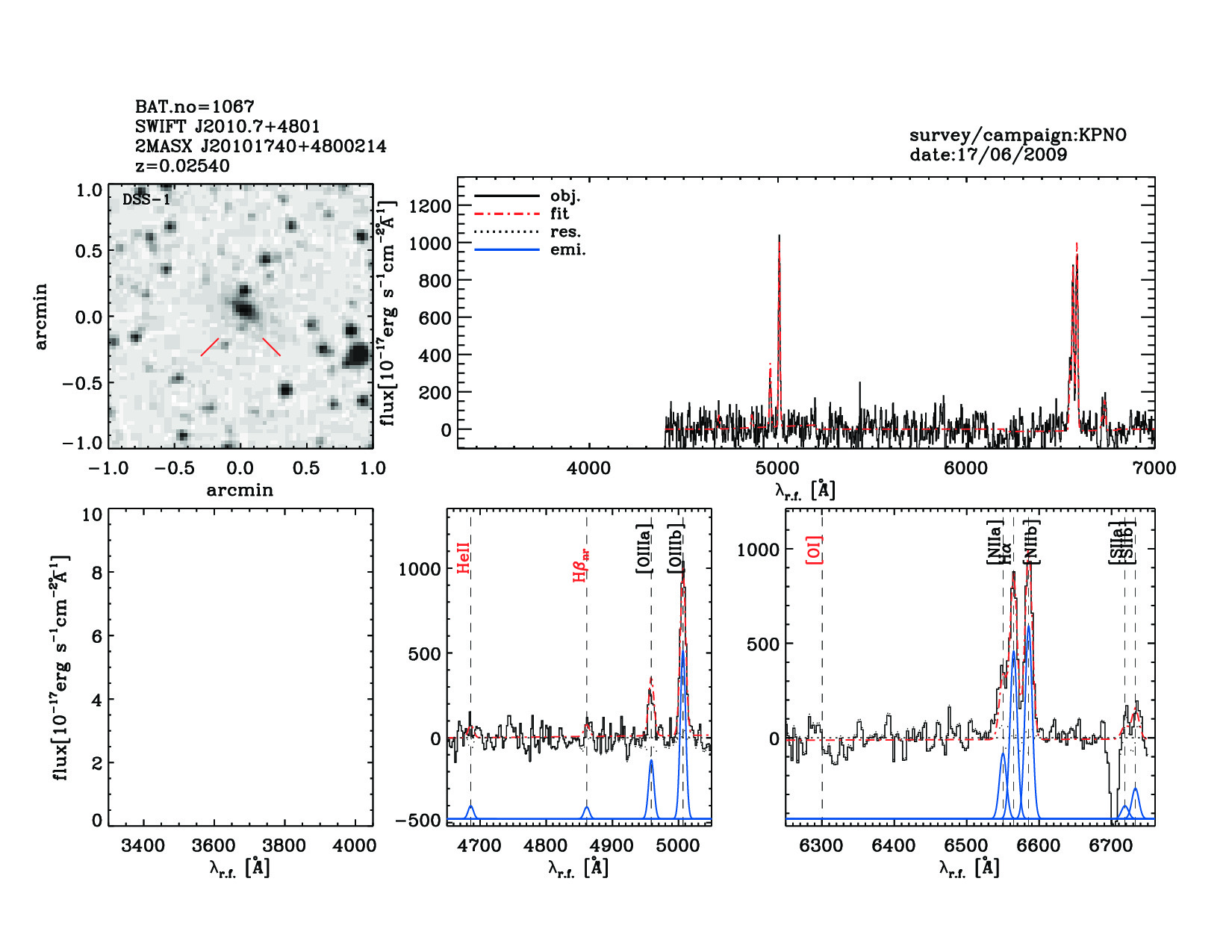 | 1067 | SWIFT J2010.7+4801 | 2MASX J20101740+4800214 | 302.5725 | 48.0059 | 0.02540 | 1.10 | 13.30 | 1.80 | 13.30 | 23.00[22.57-23.17] | 0.99(0.29,0.47) | optical | NED |