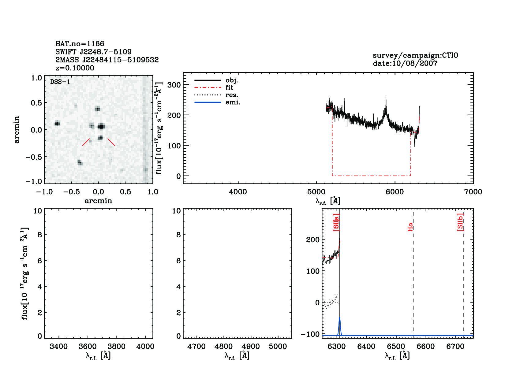 | 1166 | SWIFT J2248.7-5109 | 2MASS J22484115-5109532 | 342.1716 | -51.165 | 0.10000 | 4.60 | 9.20 | 4.60 | 9.40 | 19.85[19.73-20.21] | 1.79(0.08,0.13) | optical | NED |