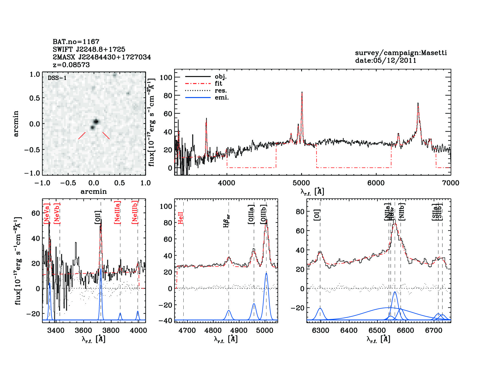 | 1167 | SWIFT J2248.8+1725 | 2MASX J22484430+1727034 | 342.1847 | 17.4509 | 0.08573 | 1.30 | 11.60 | 1.50 | 10.50 | 22.20[22.04-22.30] | 1.93(0.20,0.37) | optical | NED |