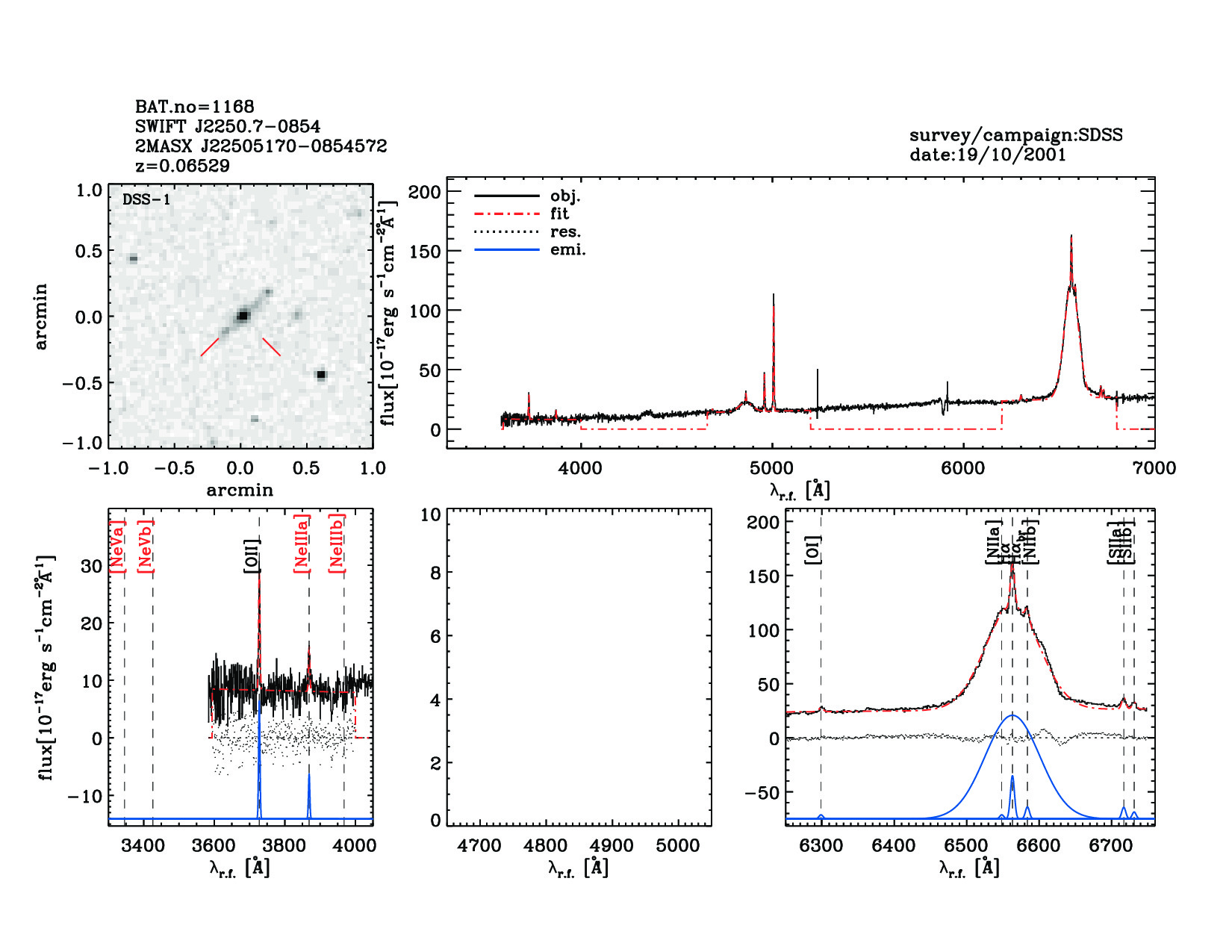 | 1168 | SWIFT J2250.7-0854 | 2MASX J22505170-0854572 | 342.7155 | -8.9158 | 0.06529 | 2.60 | 11.80 | 2.70 | 10.60 | 21.79[21.57-21.92] | 1.49(0.51,0.28) | optical | NED |