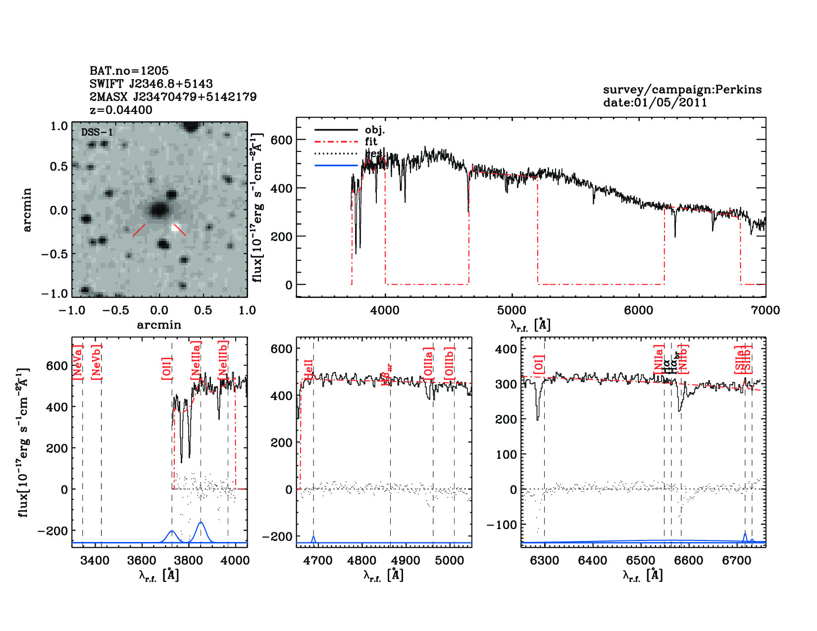 | 1205 | SWIFT J2346.8+5143 | 2MASX J23470479+5142179 | 356.7701 | 51.705 | 0.04400 | 10.50 | 9.20 | 11.90 | 10.50 | 20.81[20.70-20.88] | 2.28(0.01,0.02) | optical | NED |