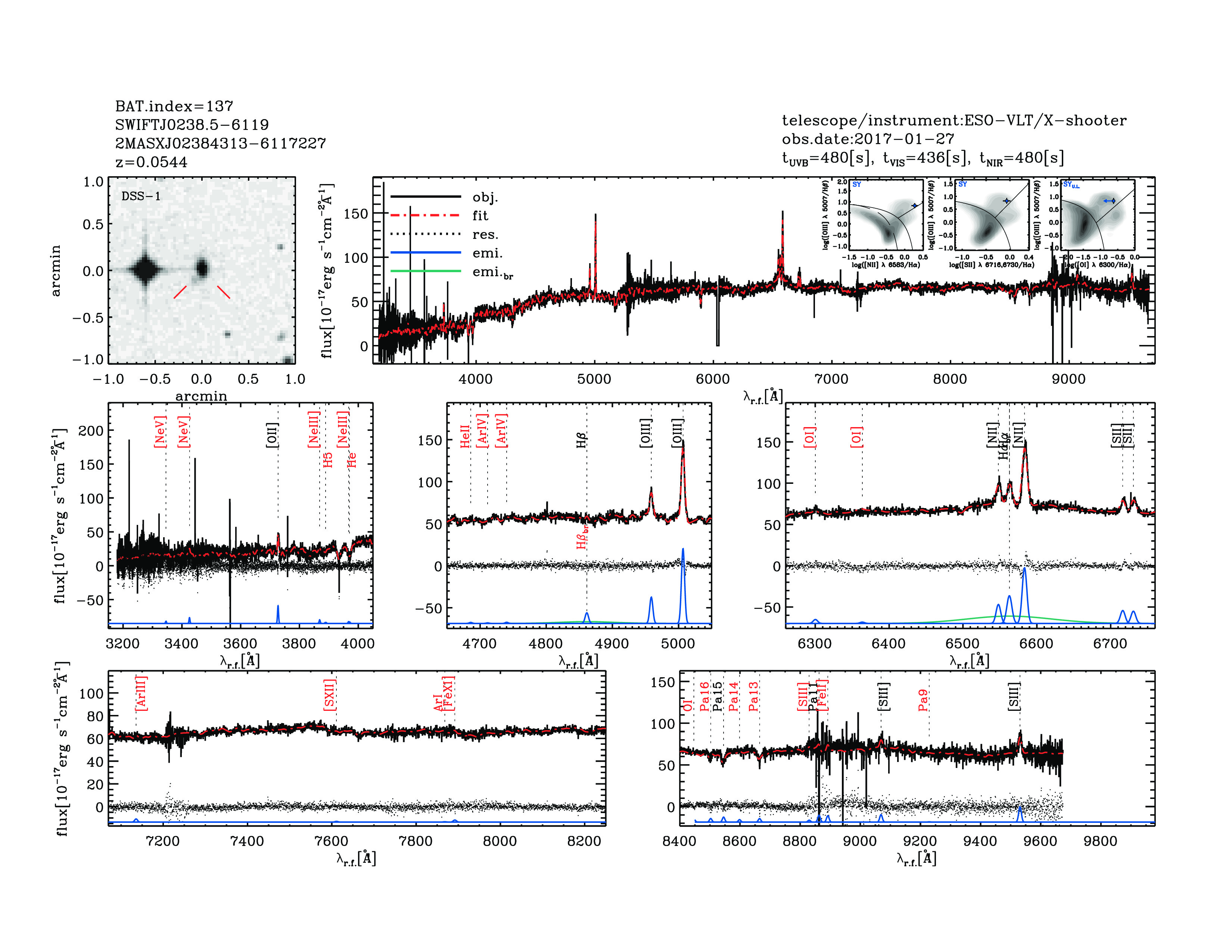 | 137 | SWIFTJ0238.5-6119 | 2MASXJ02384313-6117227 | 39.6796489 | -61.289551 | 0.05437 | 4.9 | 6.2 | 12.34 | 10.5 | 22.3[22.43-22.11] | 1.57(0.28,0.26) | optical | NED |