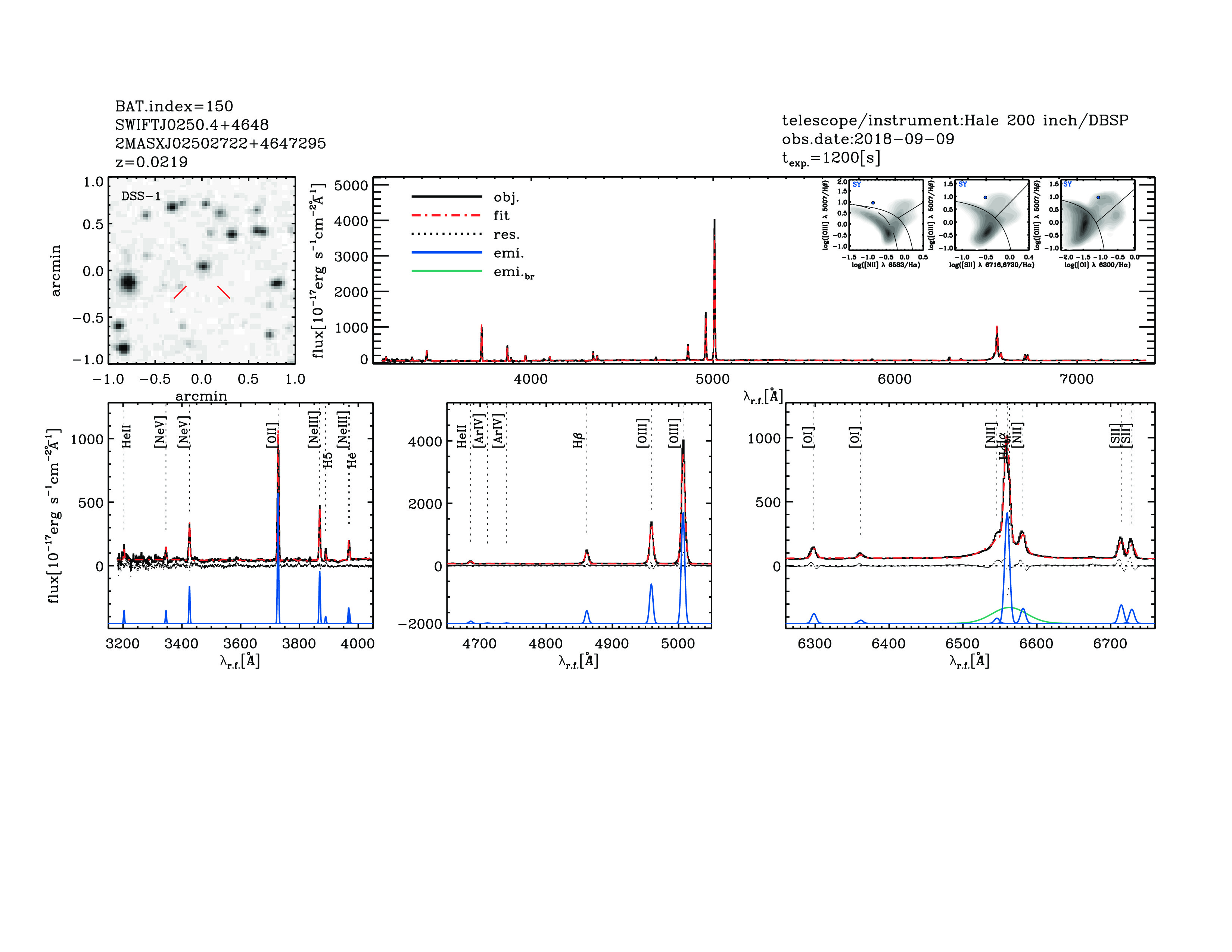 | 150 | SWIFTJ0250.4+4648 | 2MASXJ02502722+4647295 | 42.6132932 | 46.7914752 | 0.02190 | 5.7 | 7.1 | 20.04 | 17.7 | 22.46[22.56-22.34] | 1.48(0.22,0.25) | optical | NED |
