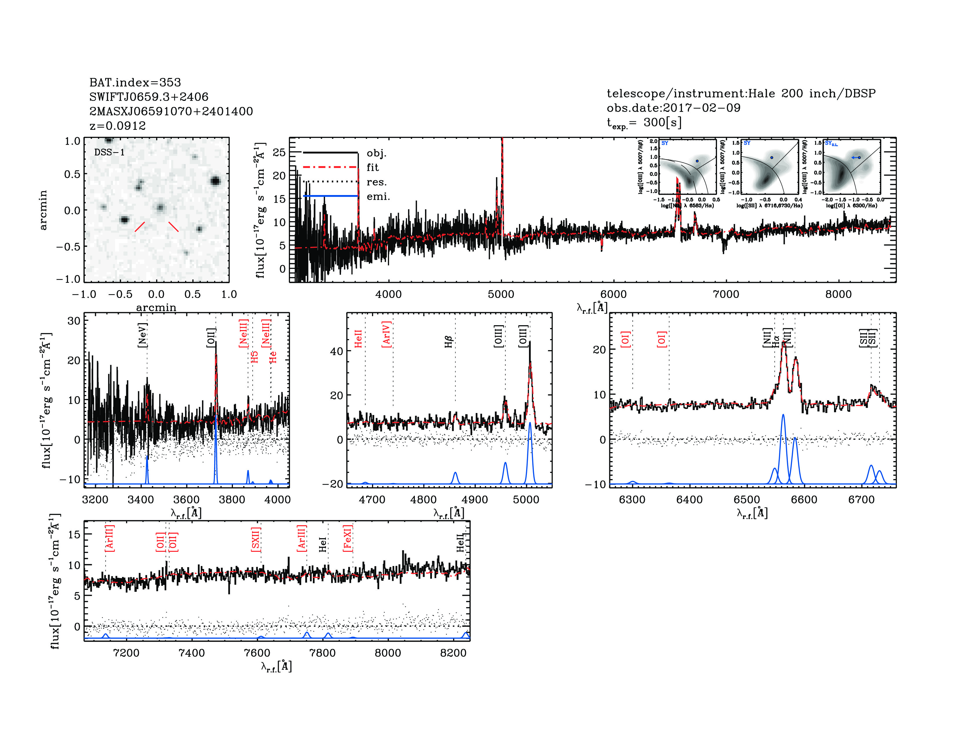 | 353 | SWIFTJ0659.3+2406 | 2MASXJ06591070+2401400 | 104.794481 | 24.0278423 | 0.09120 | 2.6 | 4.5 | 12.08 | 10.5 | 22.98[23.11-22.91] | 2(0.55,0.51) | optical | NED |