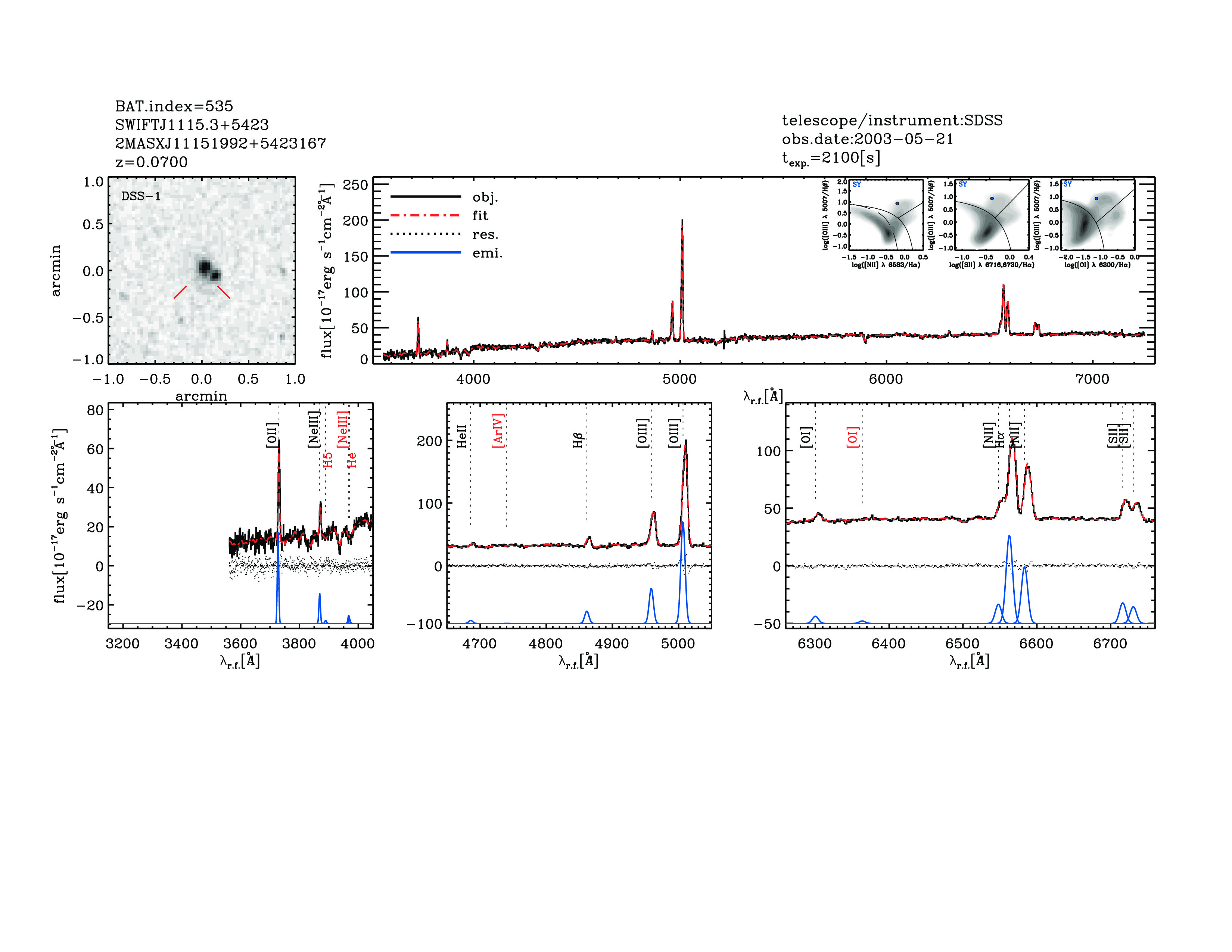 | 535 | SWIFTJ1115.3+5423 | 2MASXJ11151992+5423167 | 168.833066 | 54.3879128 | 0.07000 | 2.5 | 3.3 | 9.27 | 20.2 | 22.76[22.8-22.72] | 1.69(0.23,0.37) | optical | NED |