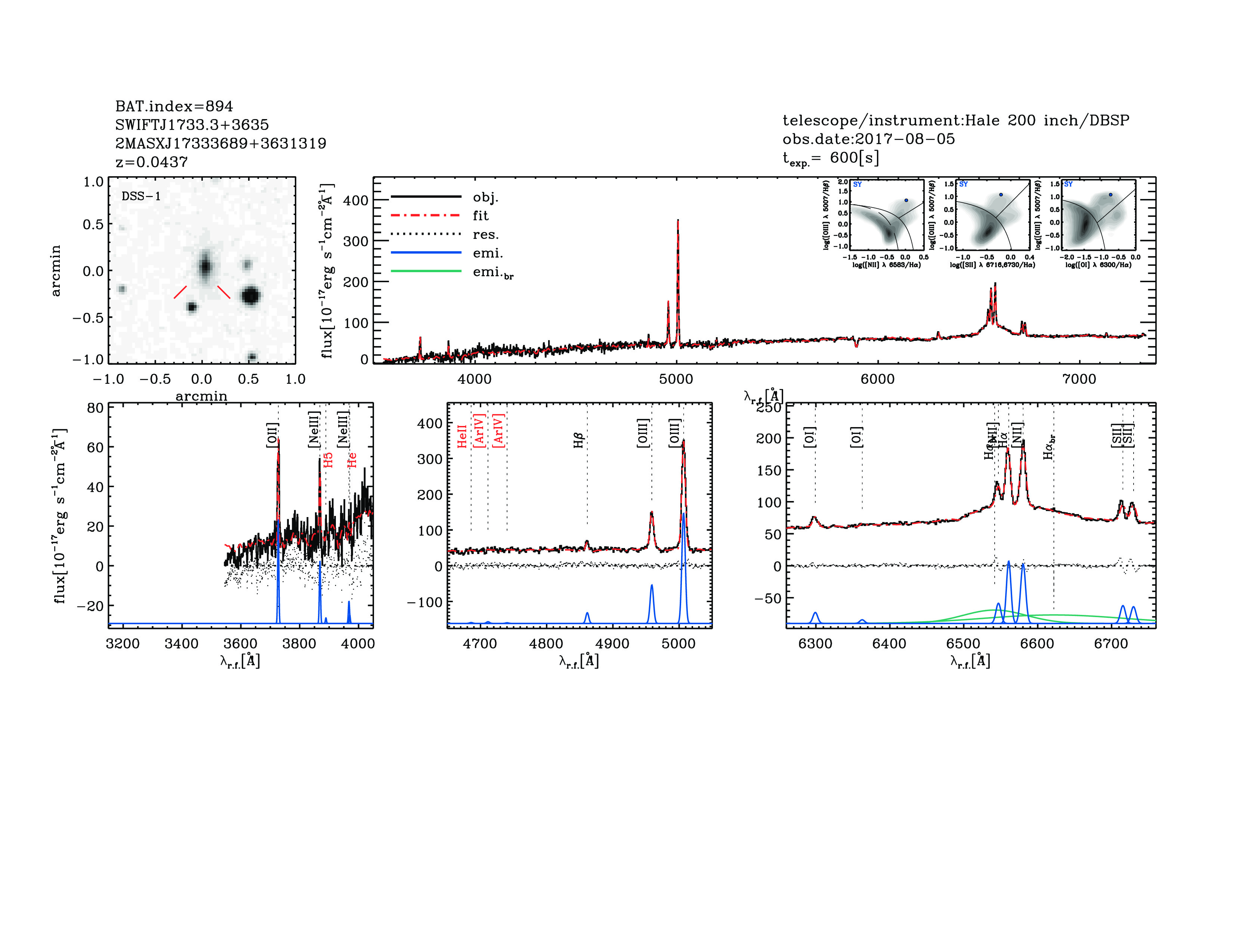 | 894 | SWIFTJ1733.3+3635 | 2MASXJ17333689+3631319 | 263.403652 | 36.5255177 | 0.04365 | 1.9 | 2 | 16.34 | 14.2 | 21.92[22.13-21.82] | 1.56(0.52,0.22) | optical | NED |