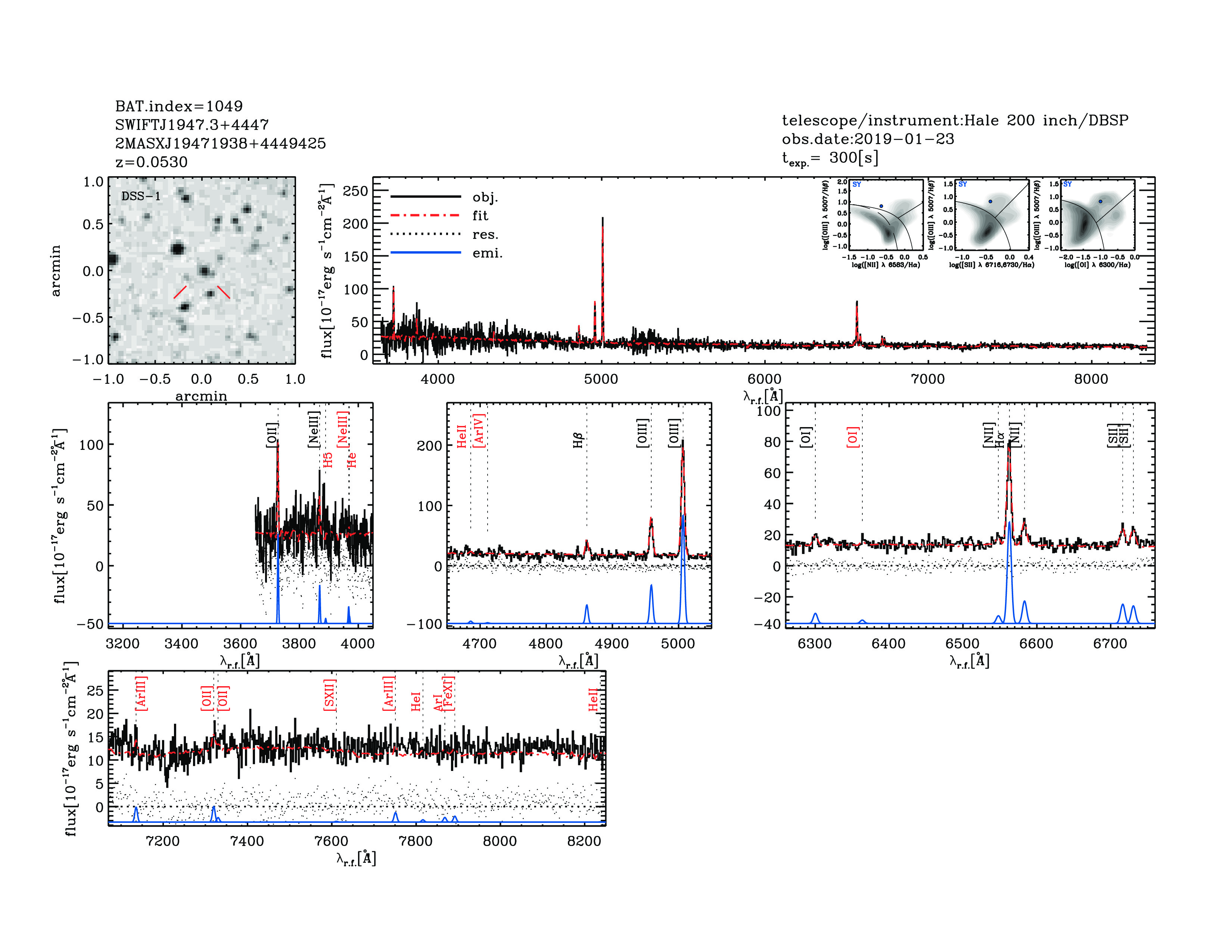 | 1049 | SWIFTJ1947.3+4447 | 2MASXJ19471938+4449425 | 296.830655 | 44.8283651 | 0.05300 | 7.6 | 11.7 | 23.95 | 21.4 | 22.84[22.87-22.82] | 1.53(0.13,0.09) | optical | NED |